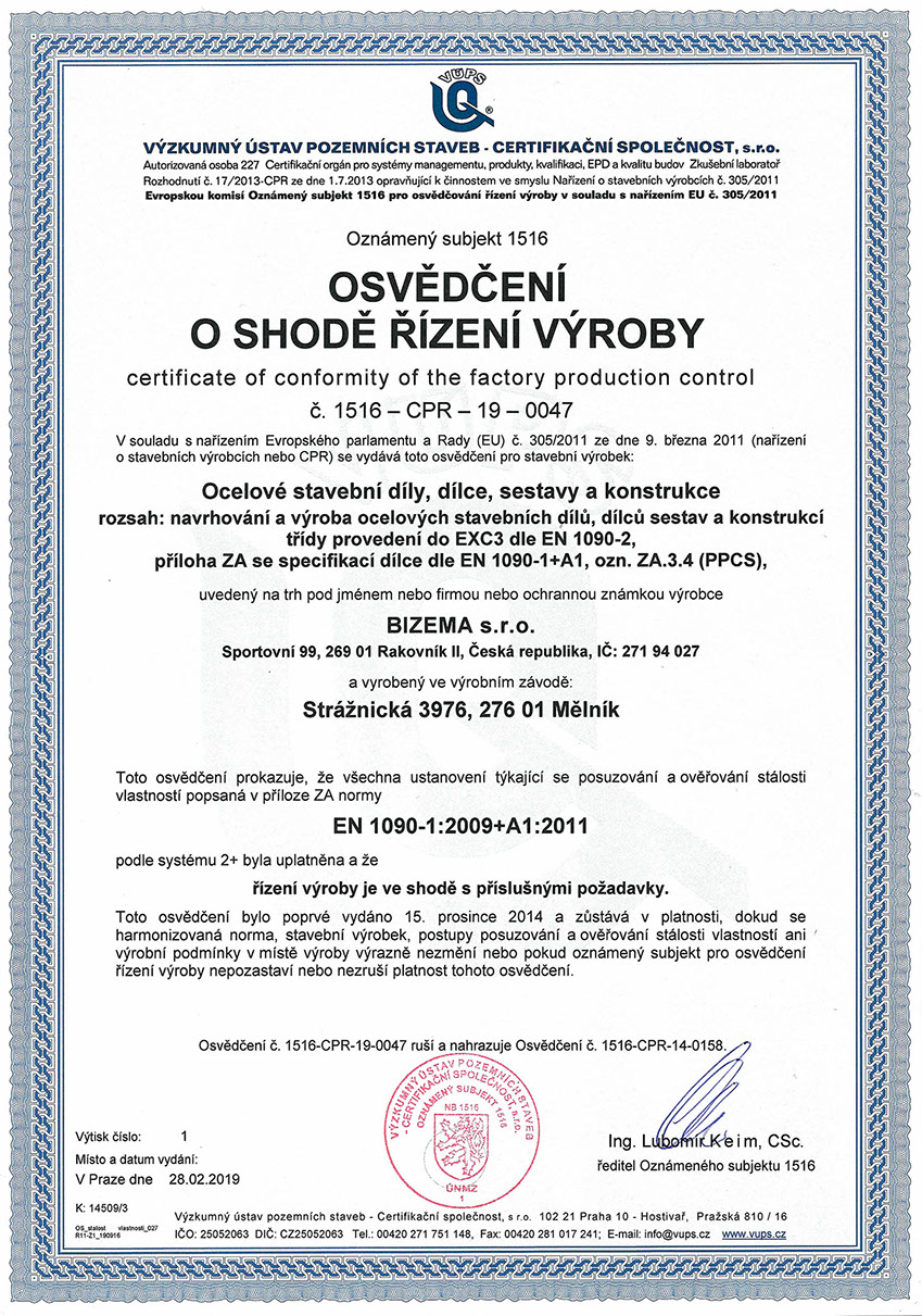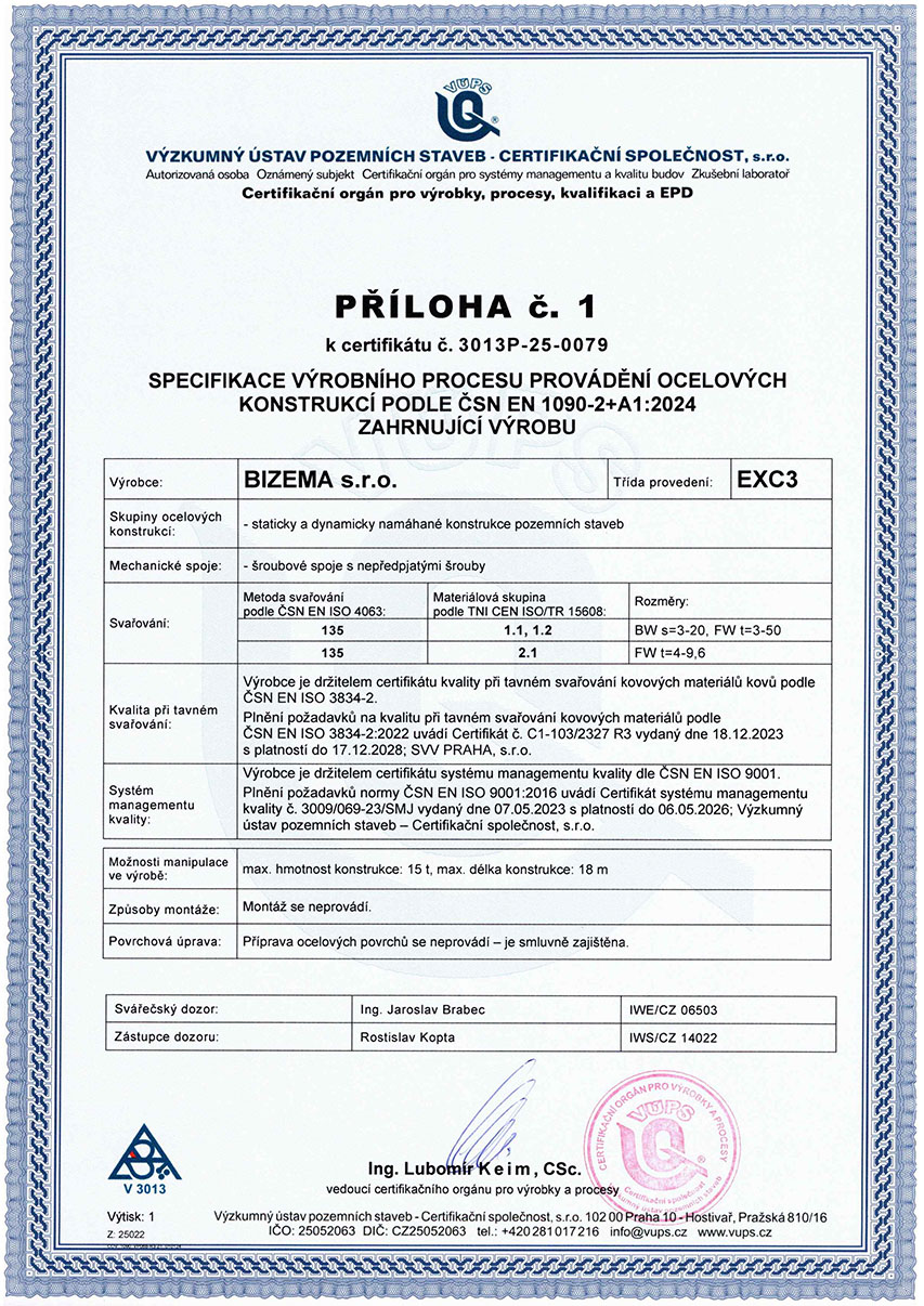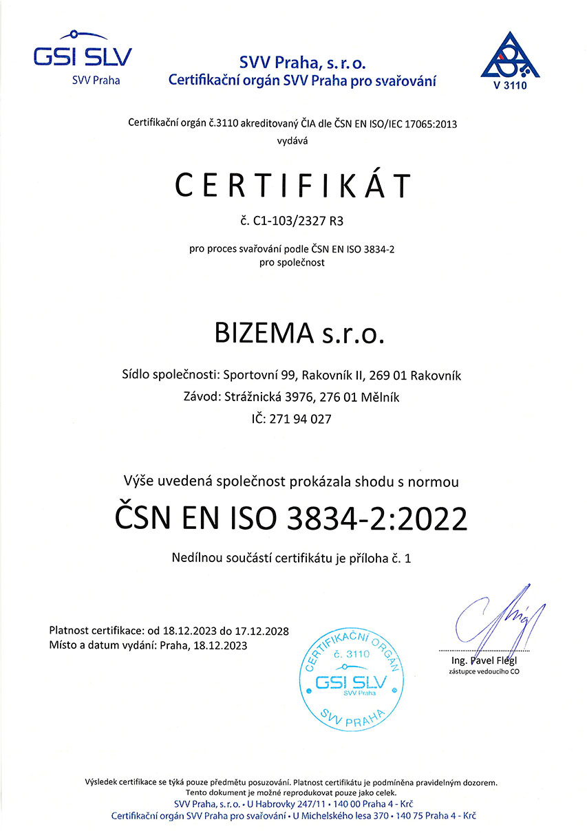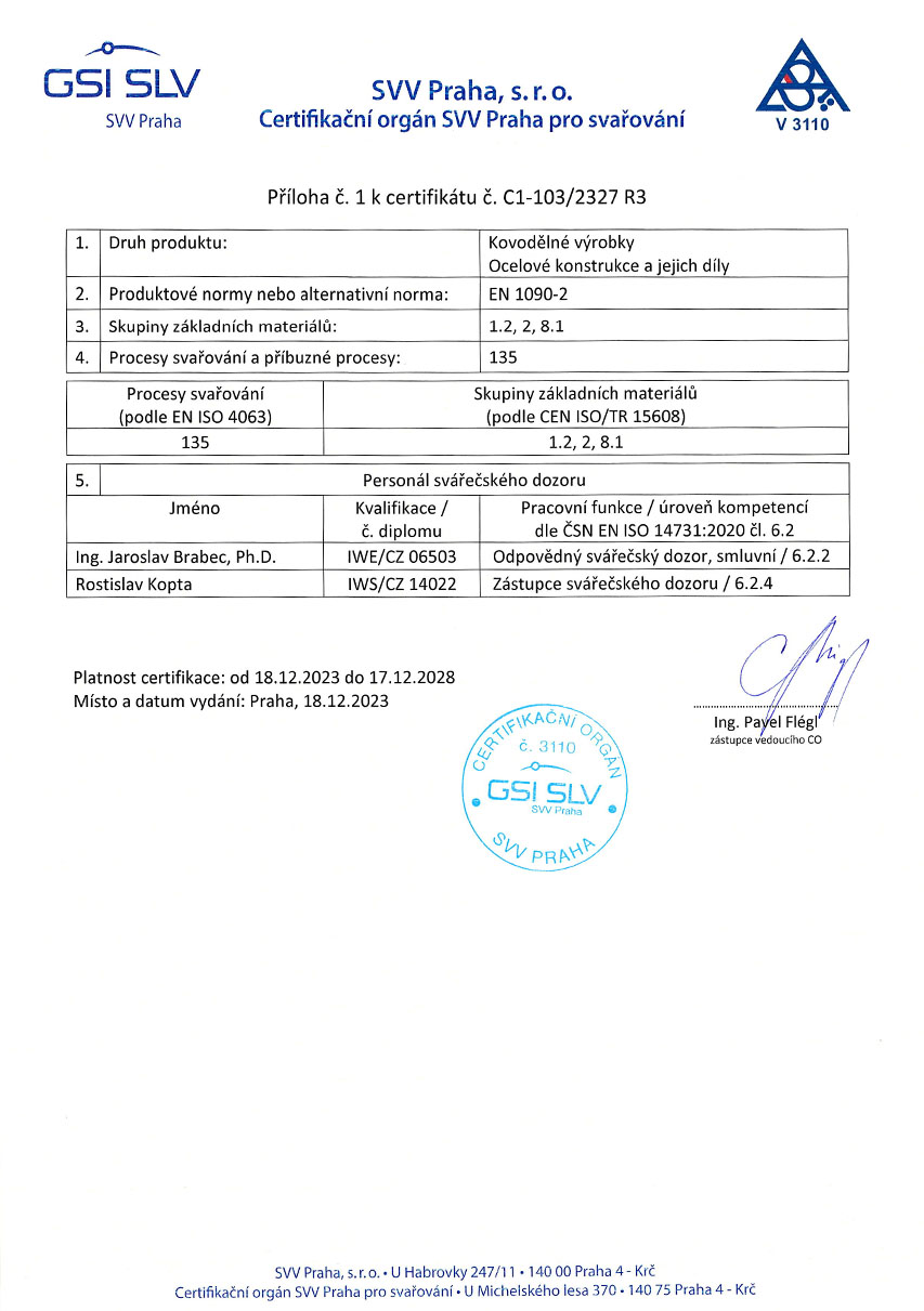 dle EN ISO 9606-01, dále je společnost držitelem certifikátu dle ČSN EN ISO 3834-2, ČSN EN 1090-1 a ČSN EN 1090-2.