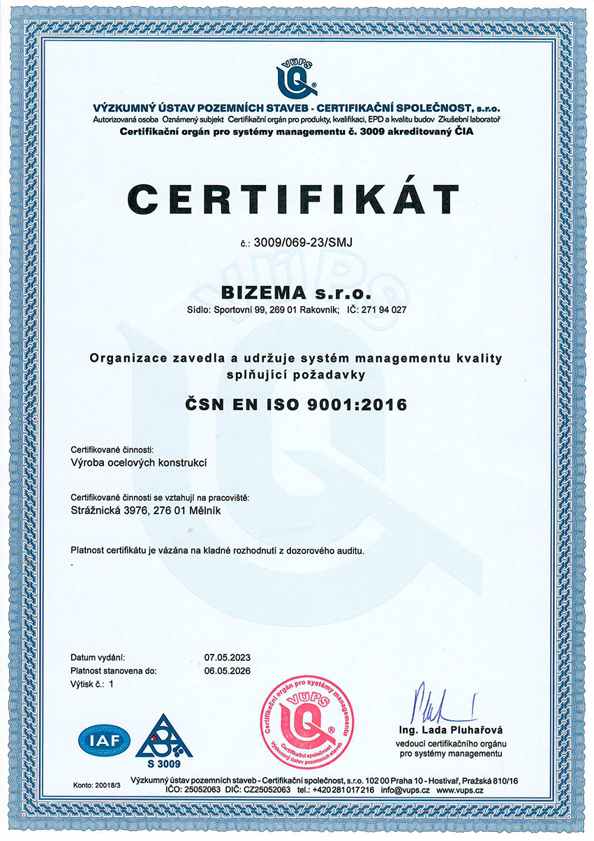 Společnost má vybudovaný systém řízení jakosti, udělením systému jakosti podle ČSN EN ISO 9001:2016.